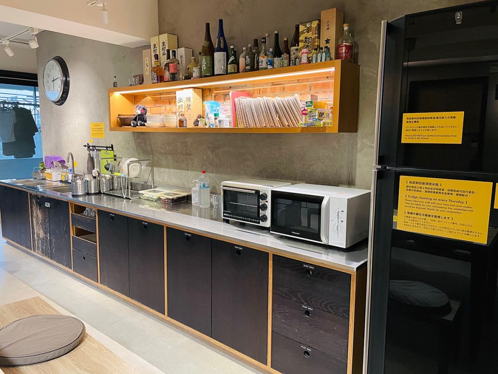 如果需要辦公或是聊天的場所,棚棚屋一樓交誼廳有數張桌椅可供旅客使用。旁邊的吧檯和冰箱還有提供泡麵、茶包和飲料,只要是在民宿公共空間即可免費享用(攜出則需要付費),十分貼心!若是想要品嘗高雄美食,附近還有苓雅市場/自強夜市,多樣的小吃、主食和手搖飲料都在這裡,鹹甜吃喝都有,走路大約 10 分鐘的距離,值得探訪!